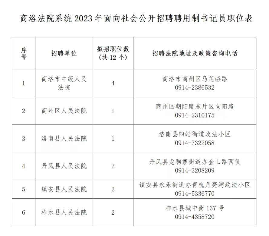 全市法院共招聘聘用制書(shū)記員12名,各法院招聘職位、地址及政策咨詢(xún)電話詳見(jiàn)《商洛法院系統(tǒng)2023年面向社會(huì)公開(kāi)招聘聘用制書(shū)記員職位表》(附件)。